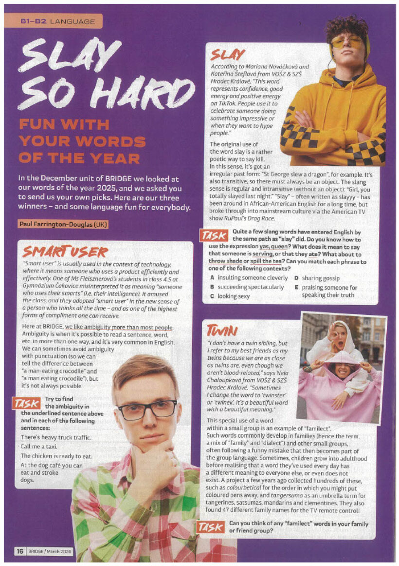 Děvčata se umístila na prvních dvou místech v celostátní soutěži vyhlášené anglickým časopisem Bridge na téma Moje slovo roku 2025. Jejich články jsou publikované v březnovém vydání časopisu Brudge. Well done!